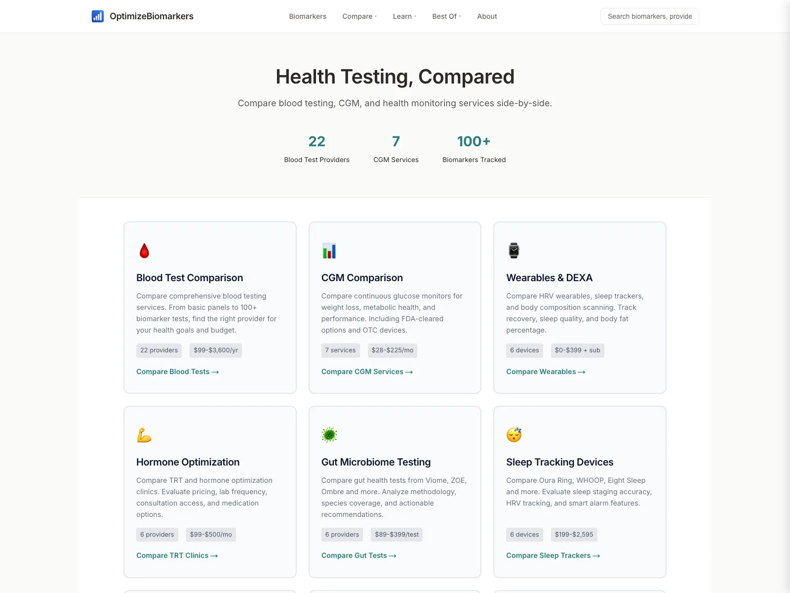Compare at-home health testing services side by side. Find the right blood work panels and biomarker packages for your health goals and budget.